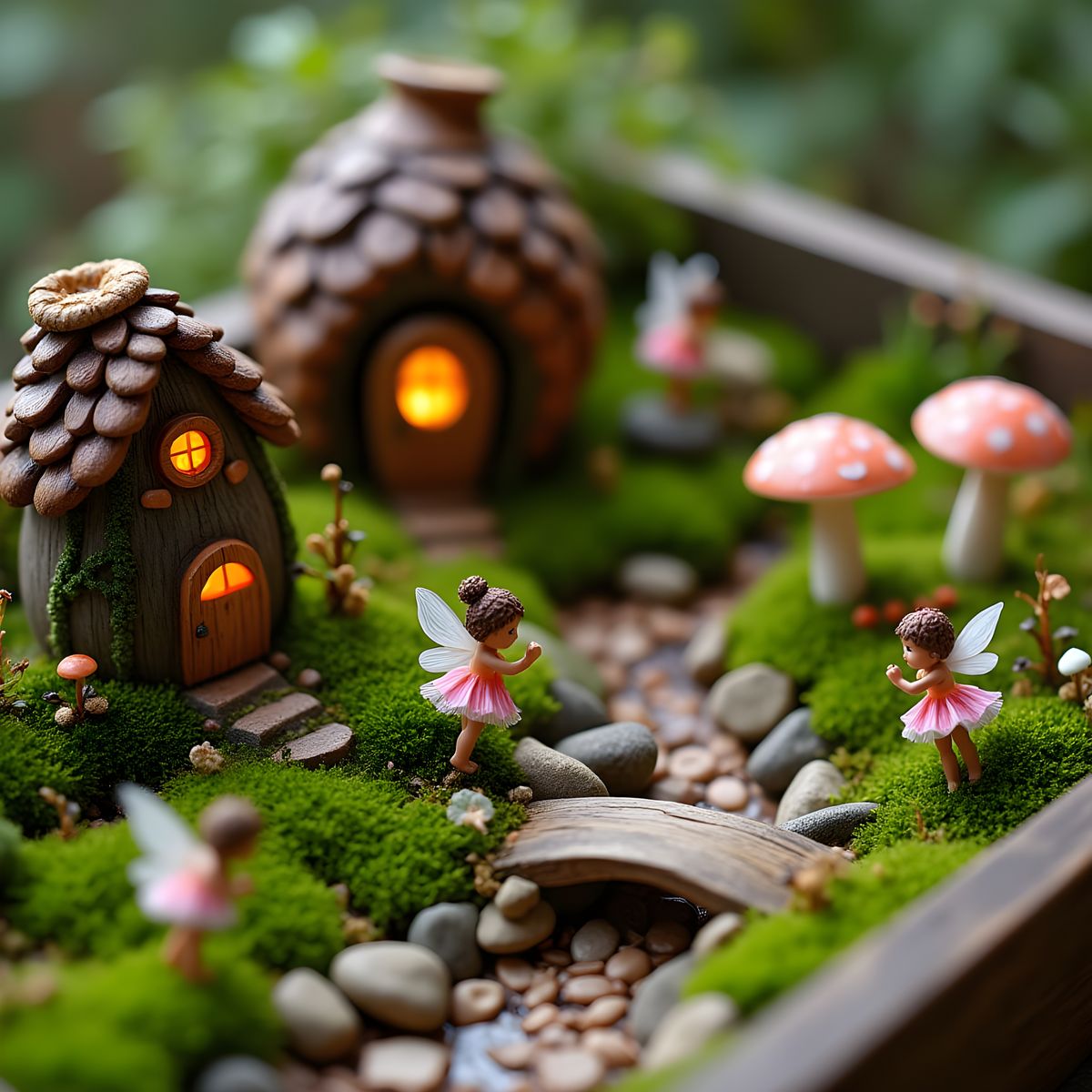 This enchanting miniature scene depicts a mystical fairy garden, complete with moss-covered landscapes, tiny houses, glowing mushrooms, and delicate flower petals used as umbrellas, all set amidst a lush, magical atmosphere