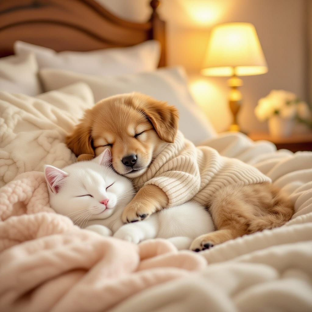 This image shows a golden puppy dozing on a white cat's belly in a cozy bedroom. Soft light fills the scene, created with watercolor textures and soothing colors.
