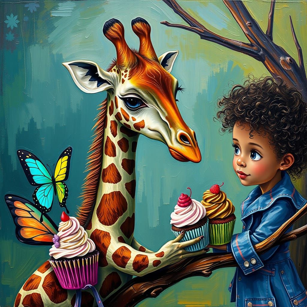 A whimsical image of a miniature giraffe with mottled green-brown coloring, carrying cupcakes. The surreal scene features children and a glowing butterfly, rendered with thick, textured brushstrokes in an impasto style.