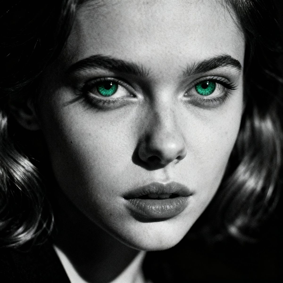 A hyperrealistic black and white portrait of Molly, a young Russian woman with dark blonde hair and striking emerald eyes. Captured in a noir style with dramatic lighting and grainy texture.