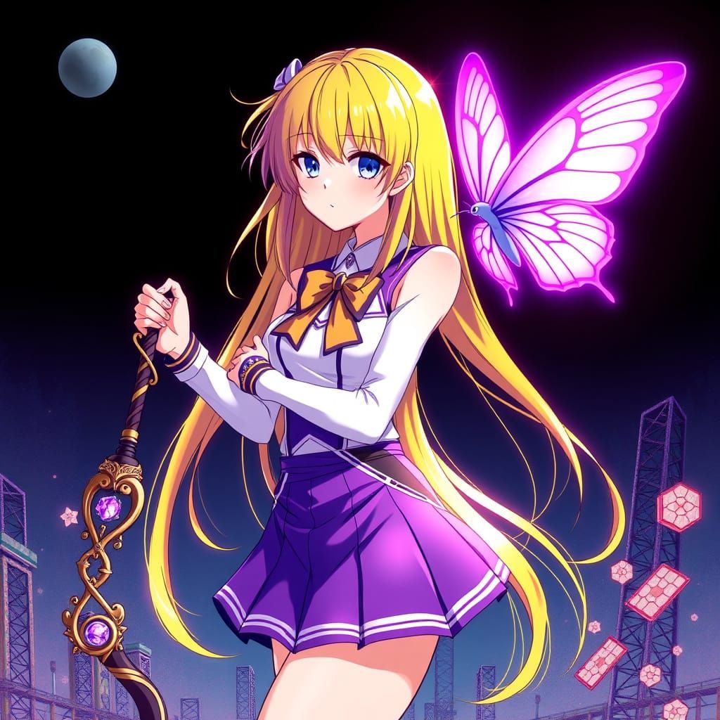 A vibrant anime girl cheerleader stands under the hypnotic control of a delicate, iridescent purple butterfly, its otherworldly energy at work in a dreamlike, surreal scene with bold, high-contrast colors and dynamic illustrations reminiscent of Hajime Sorayama and Kamome Shirahama