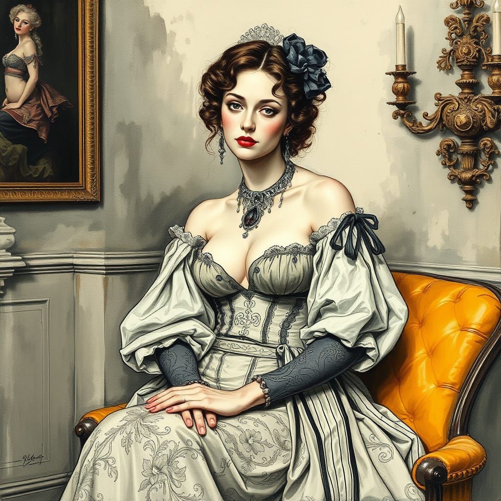This image is a hyper-realistic charcoal drawing in a Gouache and Watercolor style, featuring a refined subject in intricate attire, with thick brush strokes and impasto textures evoking a Museum-quality Epic Impressionist masterpiece