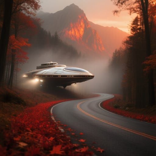 This image shows a vintage spaceship on a winding road covered in autumn leaves, set within a misty forest. The cinematic scene is bathed in warm light, with grainy mountain landscapes providing a dramatic backdrop in a film noir style.