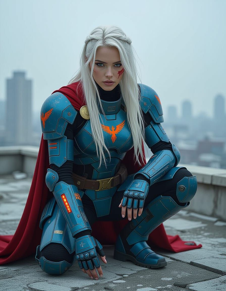 This image shows a fierce woman in futuristic armor, perched on a ruined building. The scene conveys a gritty, dystopian feel with advanced technology and augmented features. Her red cape flows in the wind.