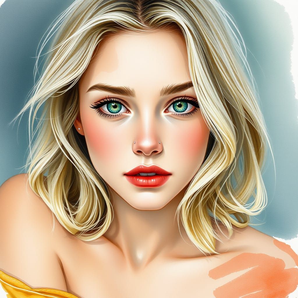 This watercolor portrait features a young woman with ash blonde hair and piercing green eyes, adorned with a delicate nose ring, exuding a dreamlike quality reminiscent of fantasy realms.