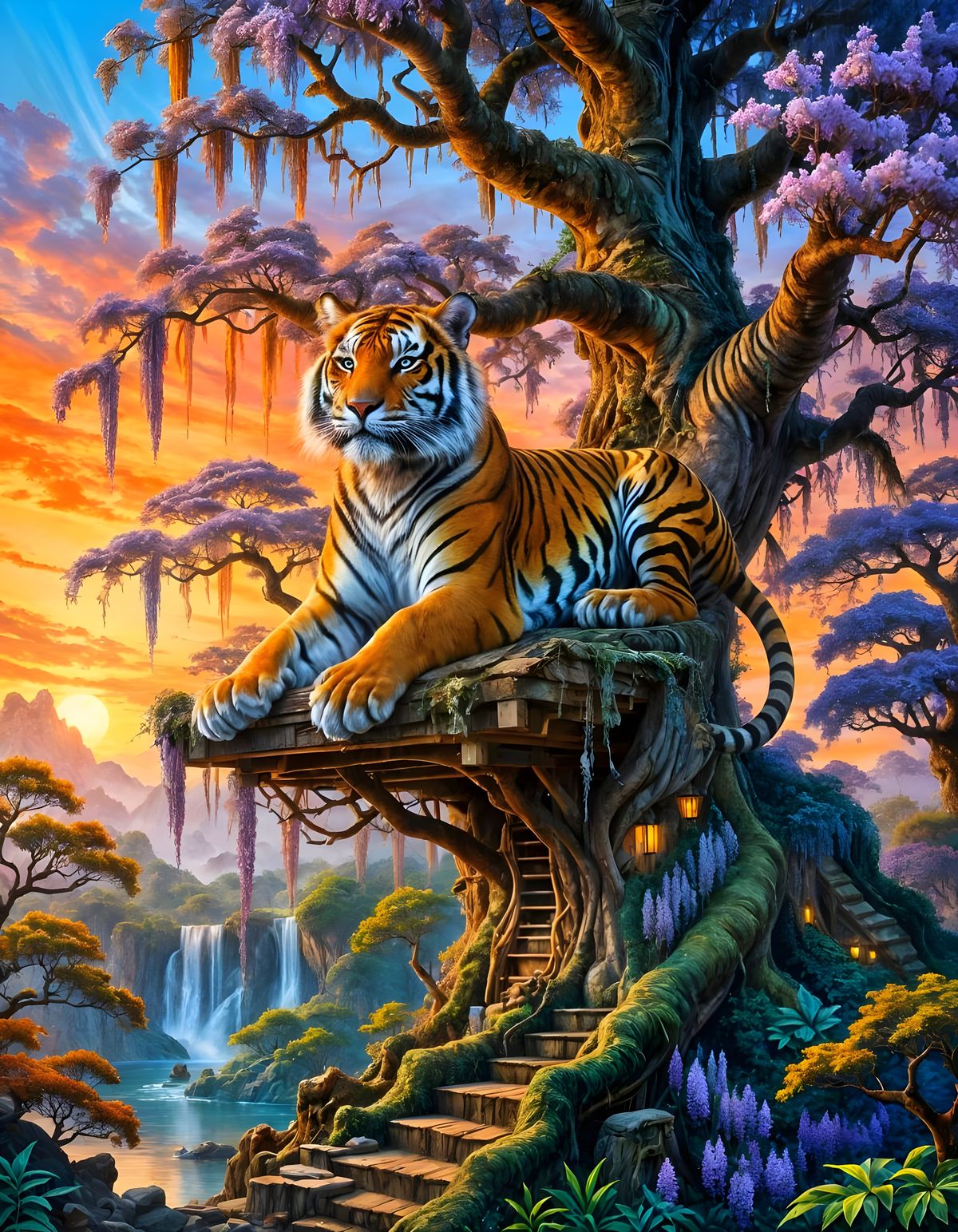 This image shows a colossal tiger resting on a detailed pagoda treehouse, bathed in warm sunset light. The artwork features intricate details and vivid colors, evoking a surreal and whimsical atmosphere.