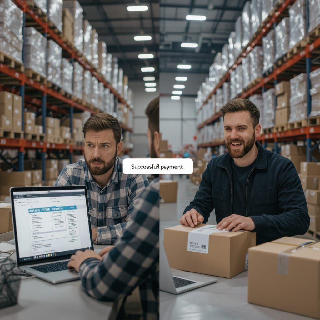 This split image shows a webshop owner's journey from frustration over abandoned carts to elation with successful sales, depicted in a dynamic, commercial style.