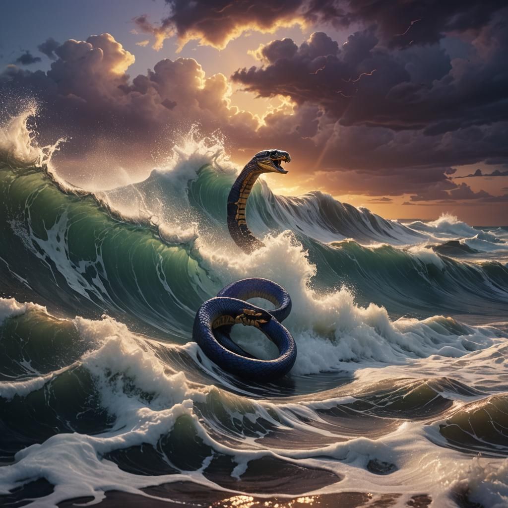 A striking picture of a giant cobra rising from a stormy sea. The image features dramatic lighting, iridescent scales, and frozen sea spray, all rendered with vibrant colors and incredible detail.
