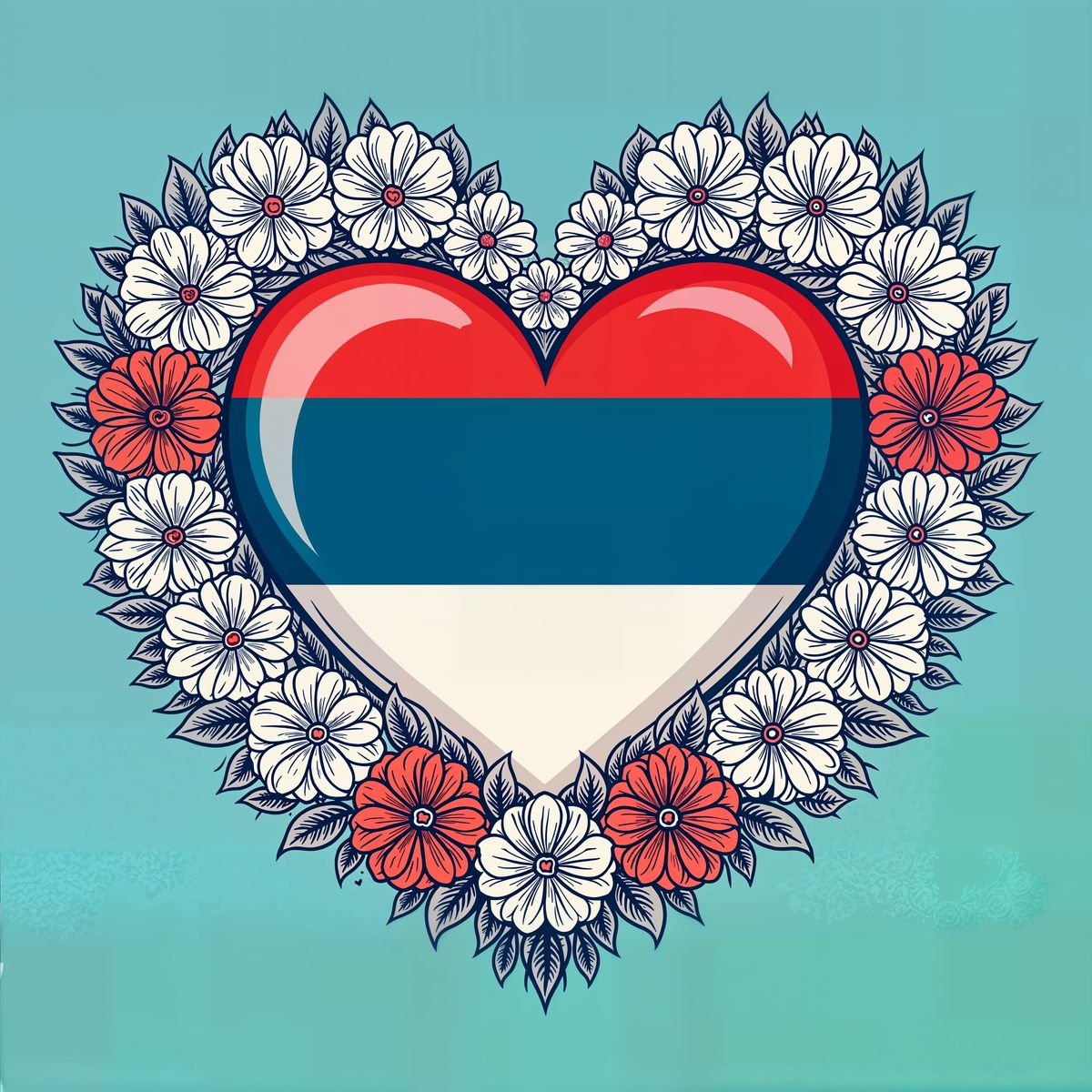 This image shows a heart-shaped Serbian flag adorned with an elaborate floral wreath. The design features a creative logo style with high detail, suitable for digital applications.