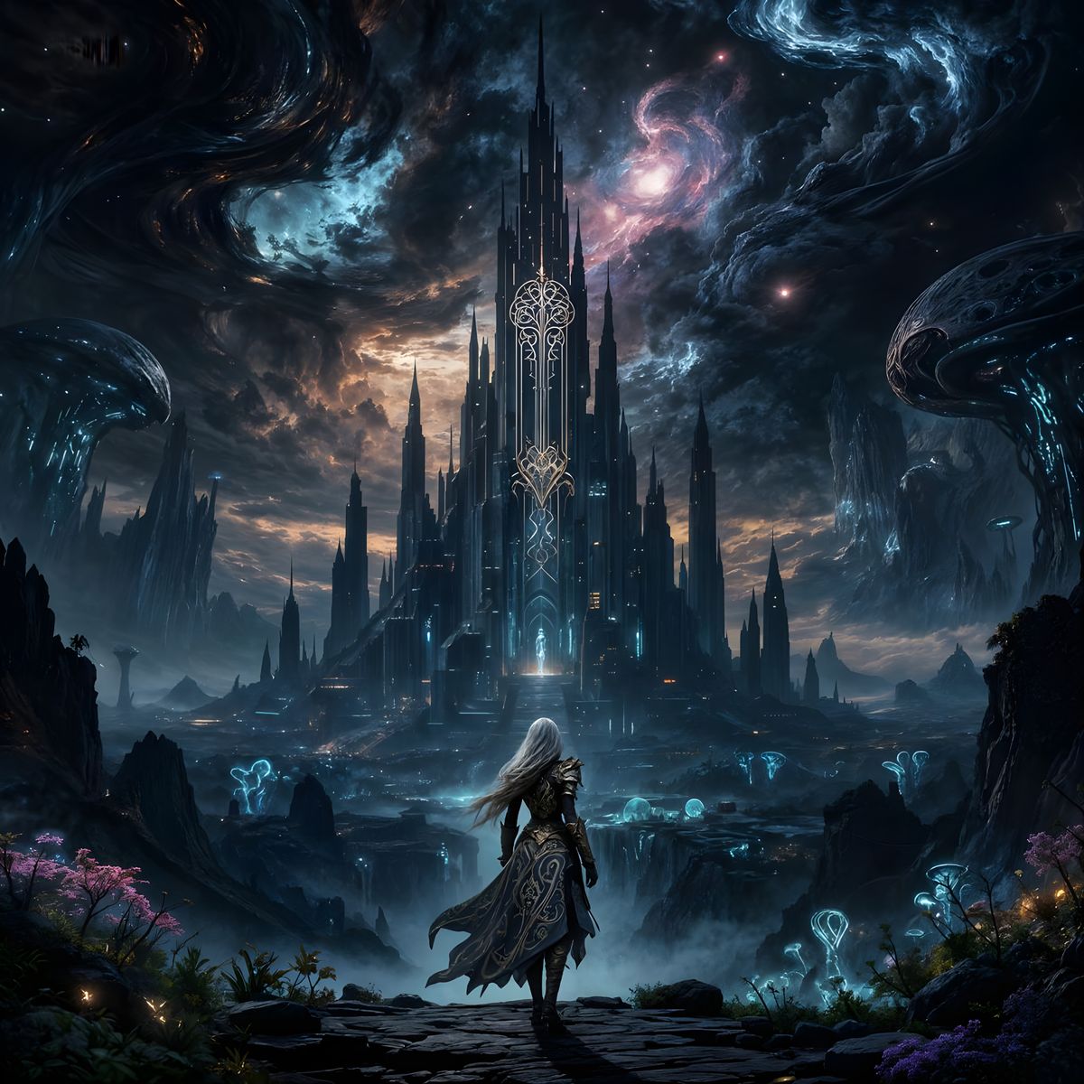 This image features a lone adventuress in ornate armor overlooking a vast, dark fantasy landscape with bio-luminescent plants and alien skies. Detailed matte painting style.