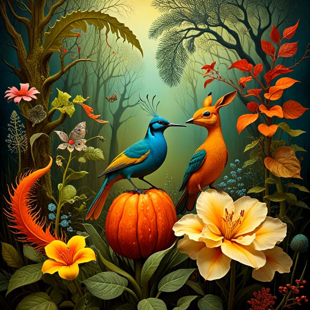 beautiful fantastic asymmetric surrealistic composition featuring bizarre fantastic animals and strange surreal fantastic plants by Andy Kehoe, Catherine Hyde, Jacek Yerka, Igor Morski, Max Ernst, Salvador Dali, Dorothea Tanning
