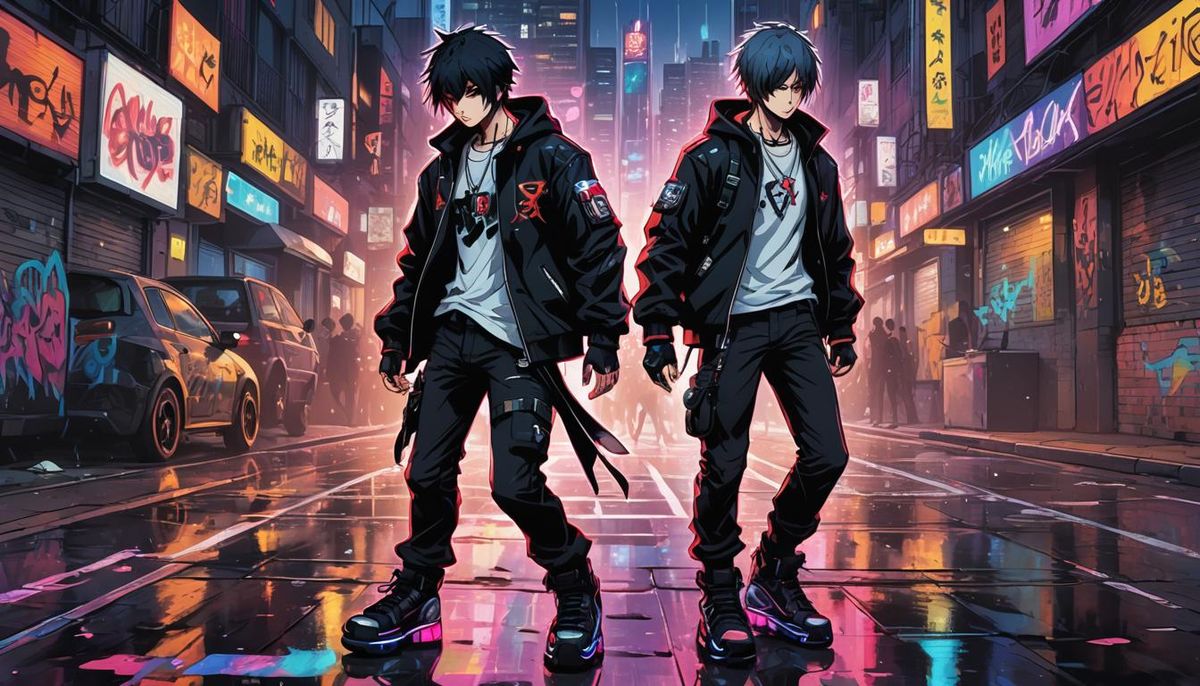 A cel-shaded anime goth boy on rollerblades stands on a neon-lit street. The image features bold lines, bright colors, and high contrast lighting, reminiscent of urban contemporary art.
