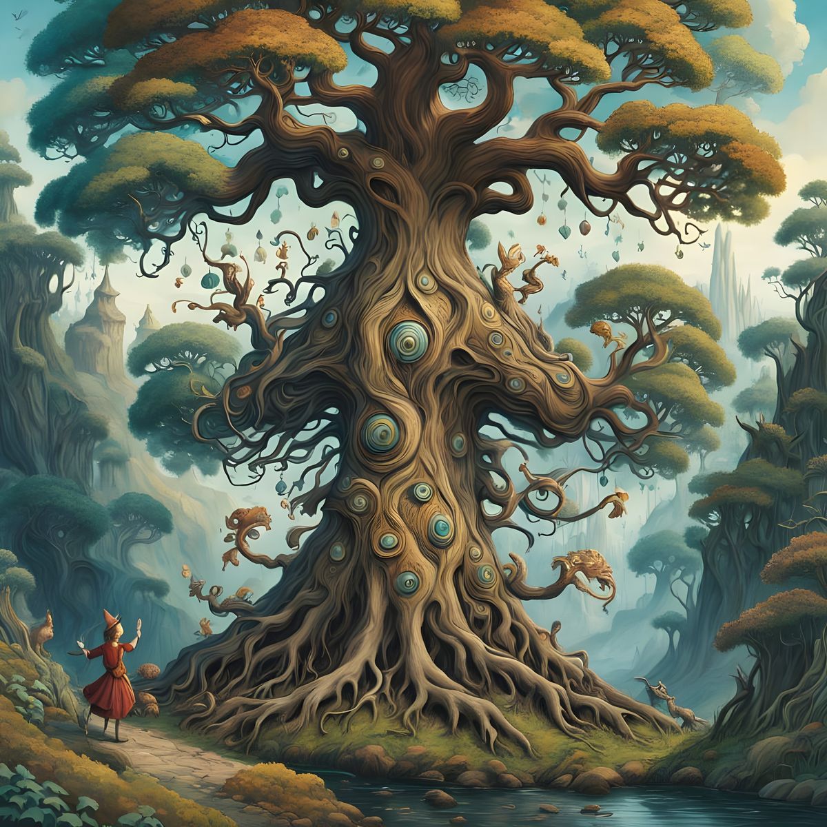 This image depicts a majestic world tree with intricate, colorful patterns, set amidst a mystical landscape reminiscent of Hayao Miyazaki's work. The tree's branches are adorned with vibrant, symbolic elements, while its roots form a complex network, evoking the style of M.C. Escher. A serene landscape w...