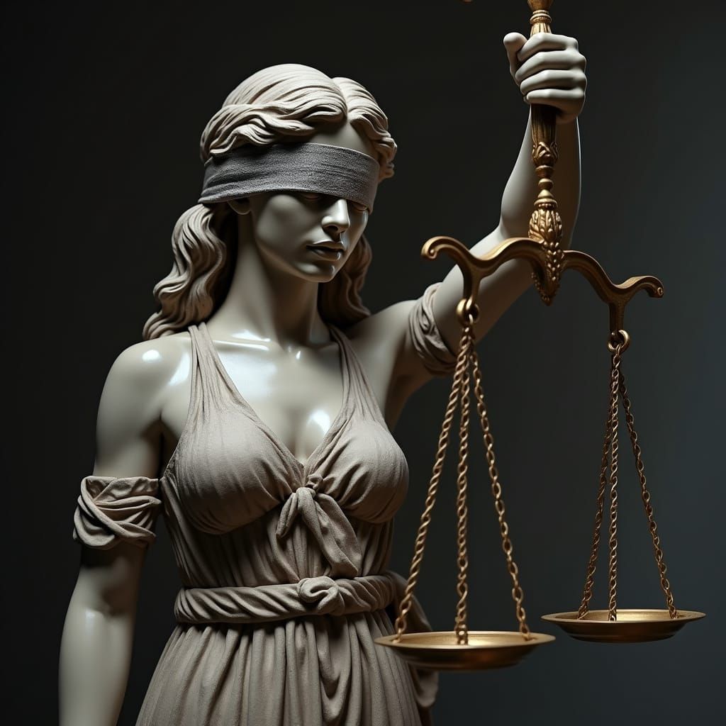 This image shows a poignant depiction of Lady Justice overcome with grief, her blindfold unable to conceal her tears as she mourns a great loss in a hauntingly realistic digital artwork.