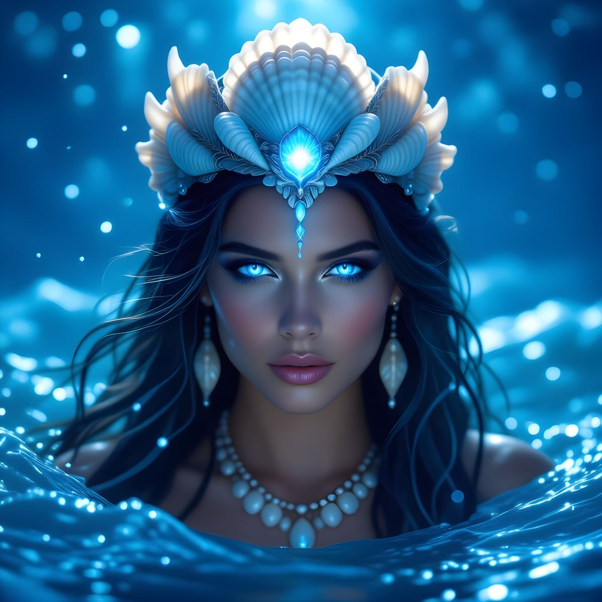A striking picture of a mystical sea priestess with luminous blue eyes. She wears a shell crown and is surrounded by moonlight and ocean waves, in a cinematic and realistic style.