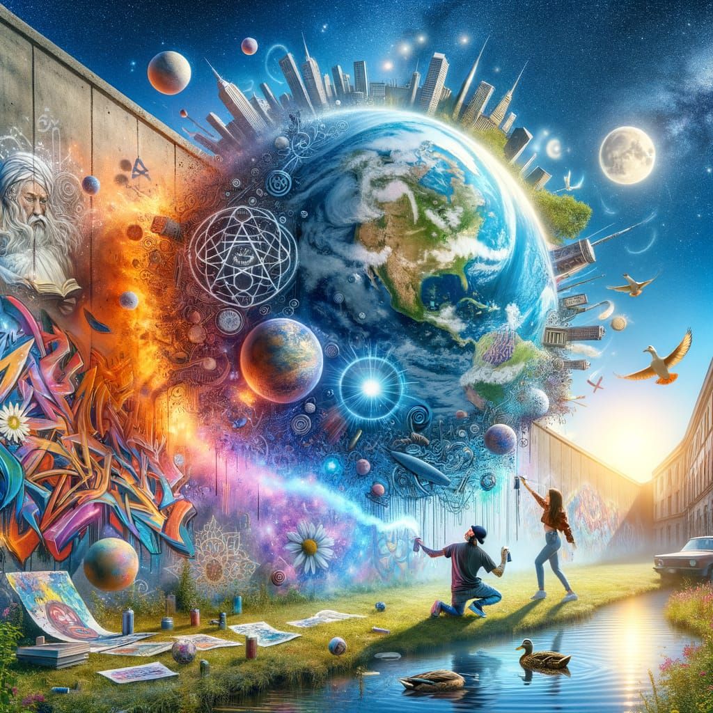This image shows a dynamic street art scene where two artists from different backgrounds collaborate on a large mural under a bright blue sky. The artwork is filled with meaningful symbols of love and divinity, surrounded by a serene pond and a peaceful duck, blending urban and natural elements in a beau...