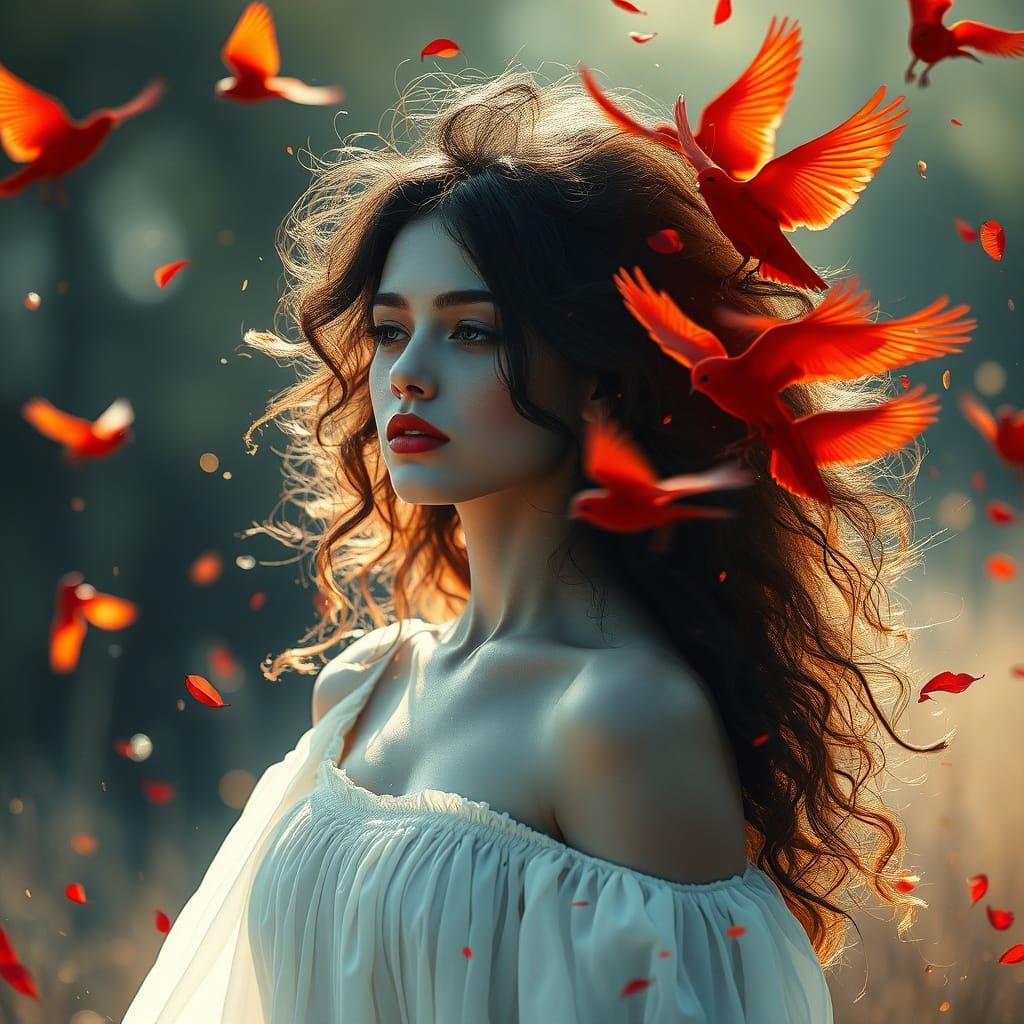 This image shows a grayscale woman in a white dress as red birds fly from her hair, scattering stardust. The scene features a softly glowing atmosphere with golden undertones, in a cinematic style.