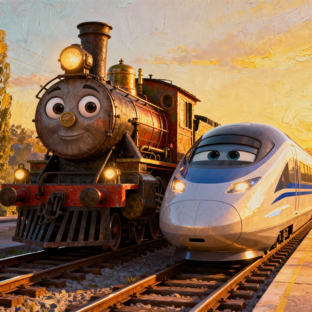 This image features a vintage steam engine and a modern maglev train as friends, shown in a cheerful Disney 3D cartoon style with large, expressive eyes and a warm, cinematic glow.