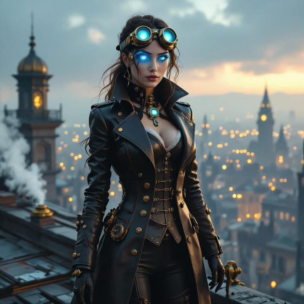 A striking picture of a steampunk woman on a rooftop. She wears a leather coat and goggles, with brass gears and glowing eyes, overlooking a gaslit city. The aesthetic is hyperrealistic with cinematic lighting.