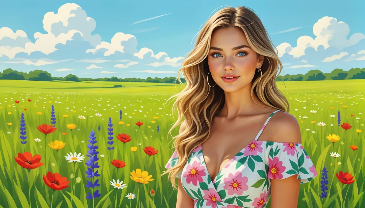 A semi-cartoon portrait of a blonde Australian woman with blue eyes, wearing a conservative dress in a field of green grass and colorful wildflowers.