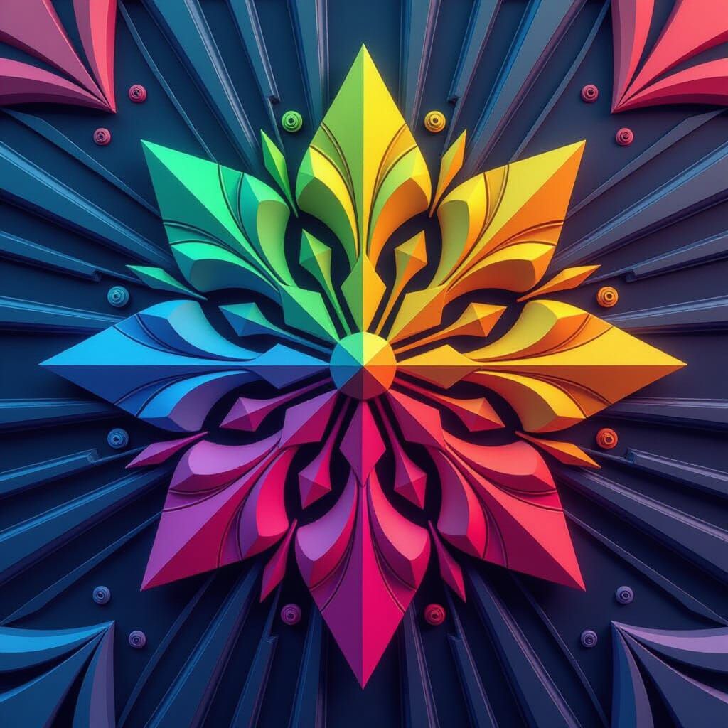 A vibrant 3D emblem featuring rainbow colors and intricate designs. The image has a Pixar-inspired CGI aesthetic with sleek lines and detailed textures.