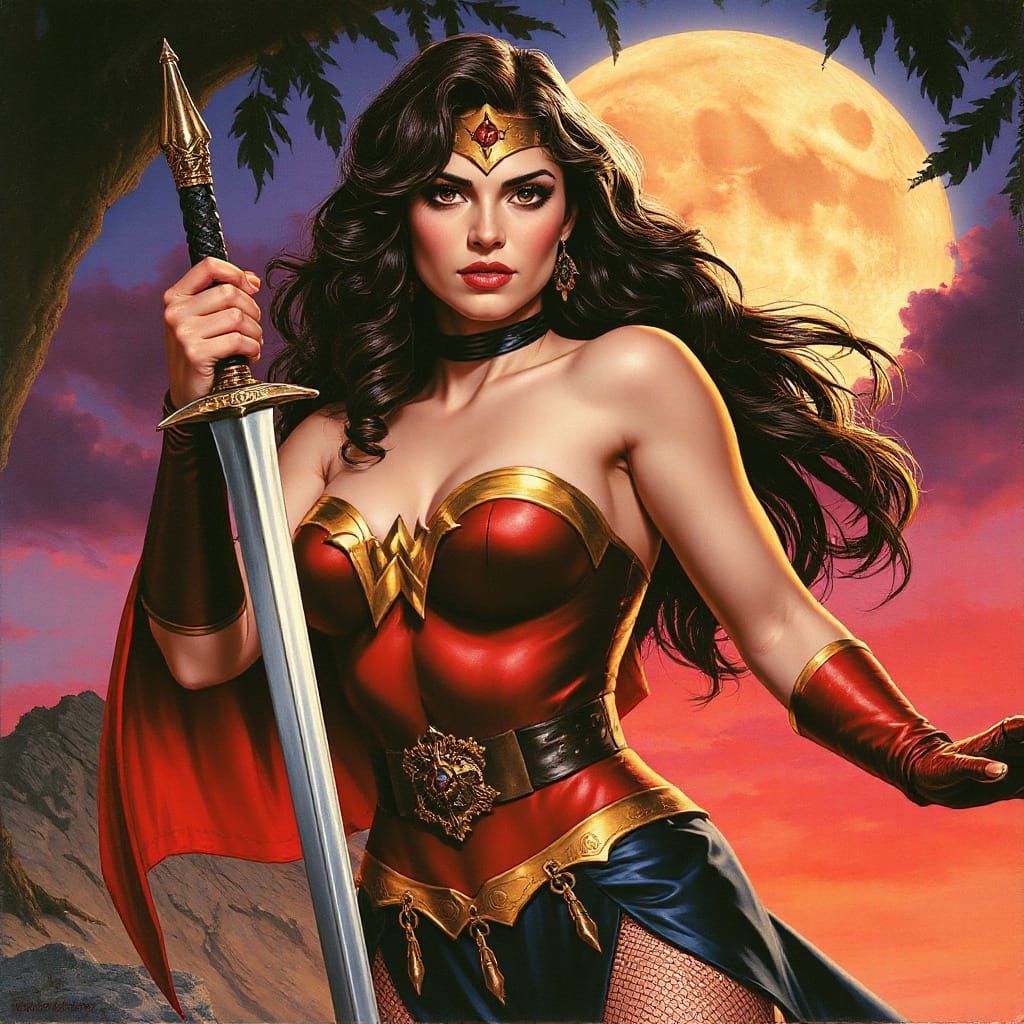 This image depicts a powerful female hero in a dark, moonlit fantasy world, blending horror and fantasy art styles.