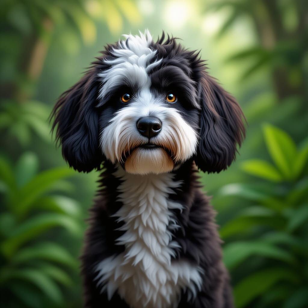 A highly detailed digital portrait of a prehistoric black and white Great fluffy hybrid Heron x Cockapoo with a fierce expression, rendered in photographic quality using 3D rendering techniques. The image is composed as a medium close-up with a central composition and artificial side lighting that creates ...