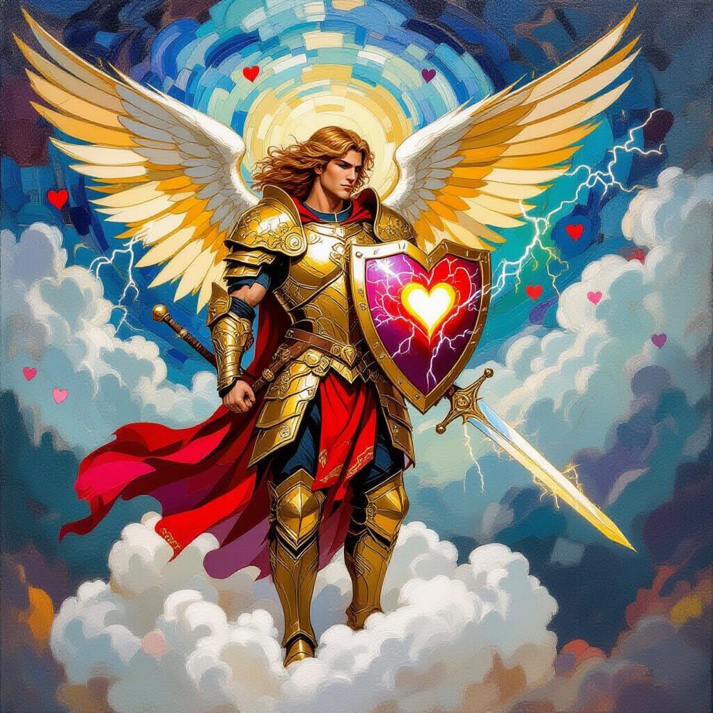 A striking picture of a male angel in golden armor standing on a cloud. The angel holds a heart-shaped shield and sword, against a swirling mosaic sky as an impasto painting.