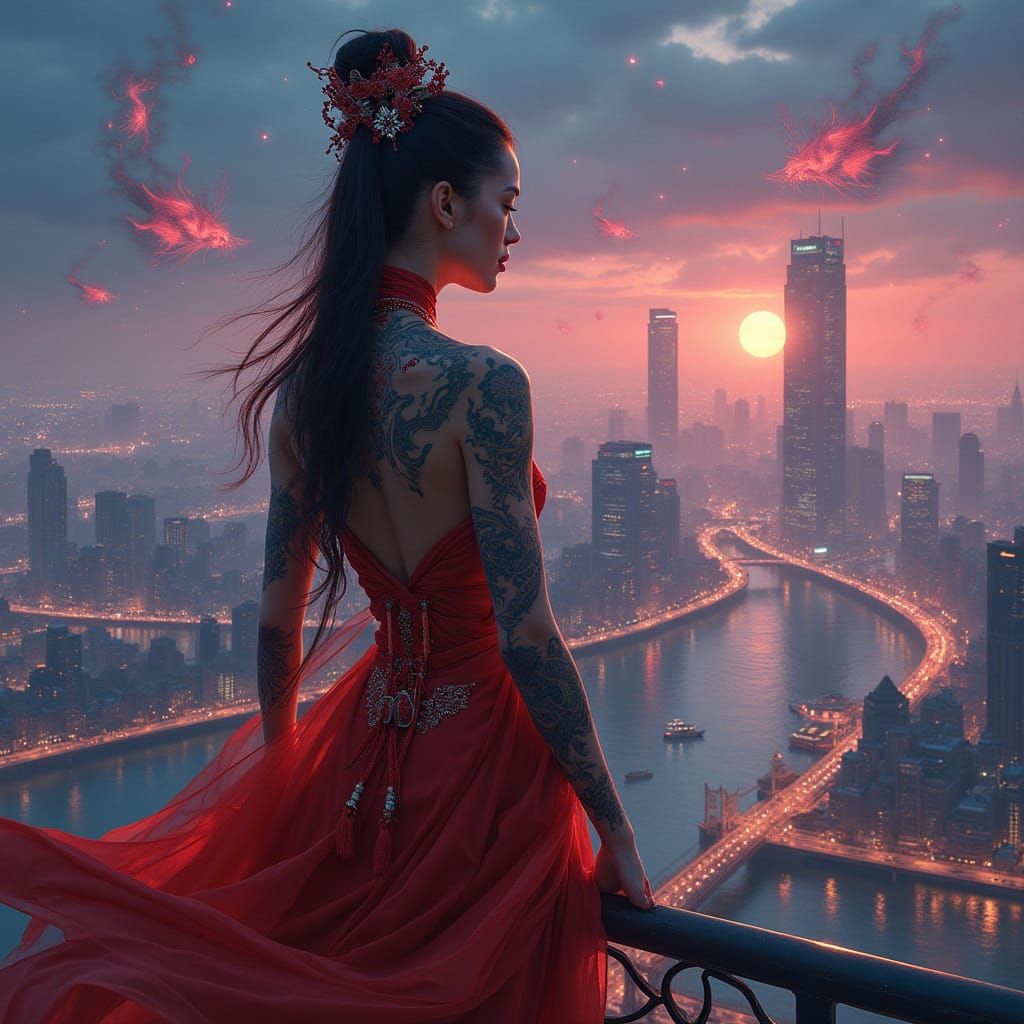A tattooed empress in a crimson qipao stands on a rooftop, gazing at a neon city. Glowing dragons and stormy skies blend tradition with cyber-mysticism in this surreal, detailed oil painting.