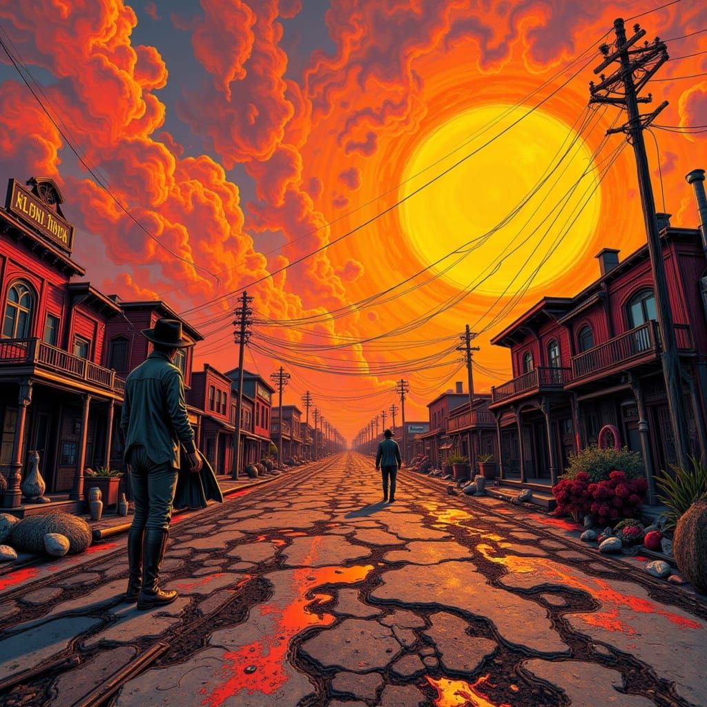 This image shows a dusty sunset scene in a Western town, reminiscent of a fractured Renaissance painting. The scene features a cowboy gunfight in a Zentek style.