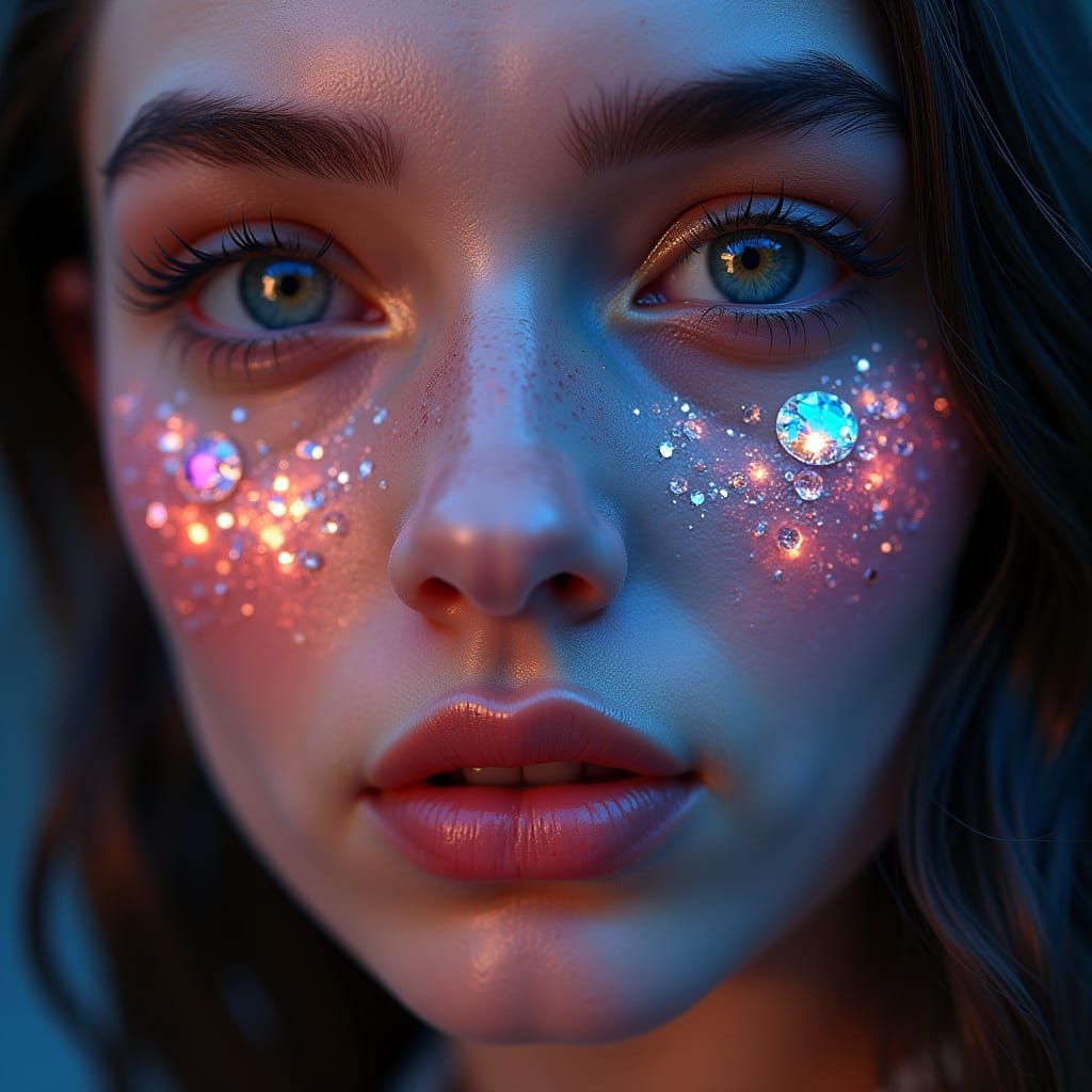This image shows a face formed from diamonds, refracting light into various colors. The diamonds are arranged to create a kaleidoscopic effect. The scene is ultrarealistic, with an anamorphic lens.