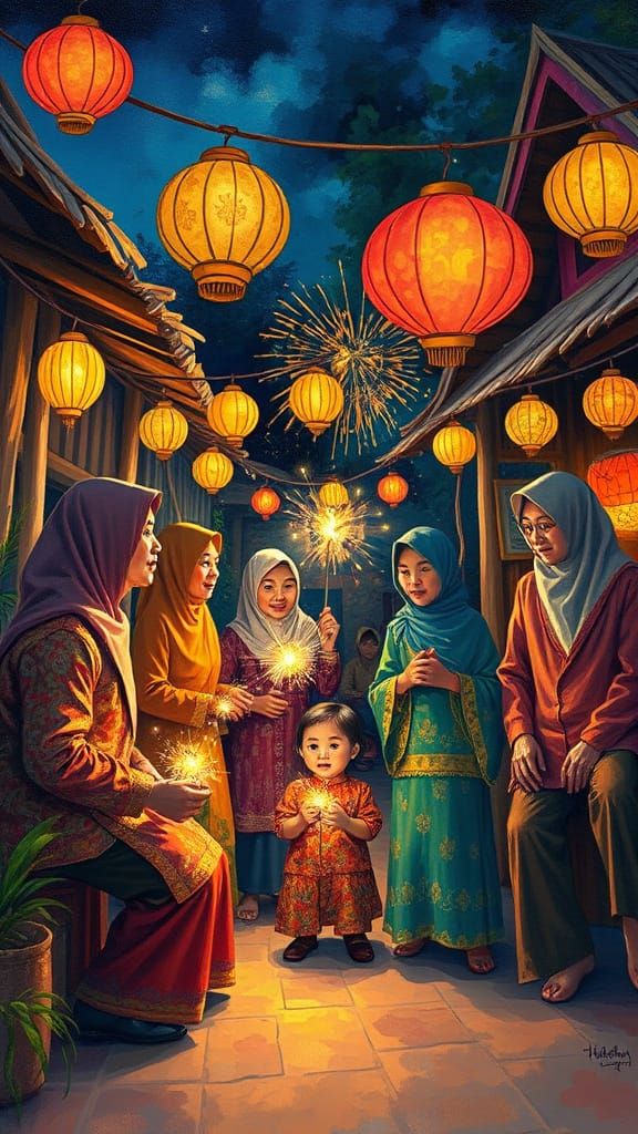 This image captures the vibrant spirit of a traditional Hari Raya celebration at night in a rustic Malay kampung setting, with families and children enjoying festive attire and sparkling fireworks amidst warm golden light and twinkling lanterns, evoking a sense of joyful community and festive atmosphere ...