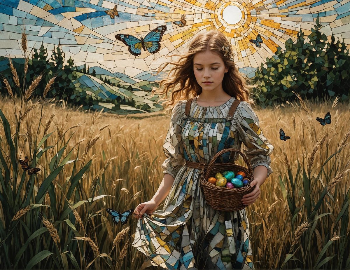 This image shows a girl with butterflies in a sunlit wheat field, holding a basket of Easter eggs. The mixed media artwork features mosaic and stained glass elements with silver particles, in a cubist art deco style.