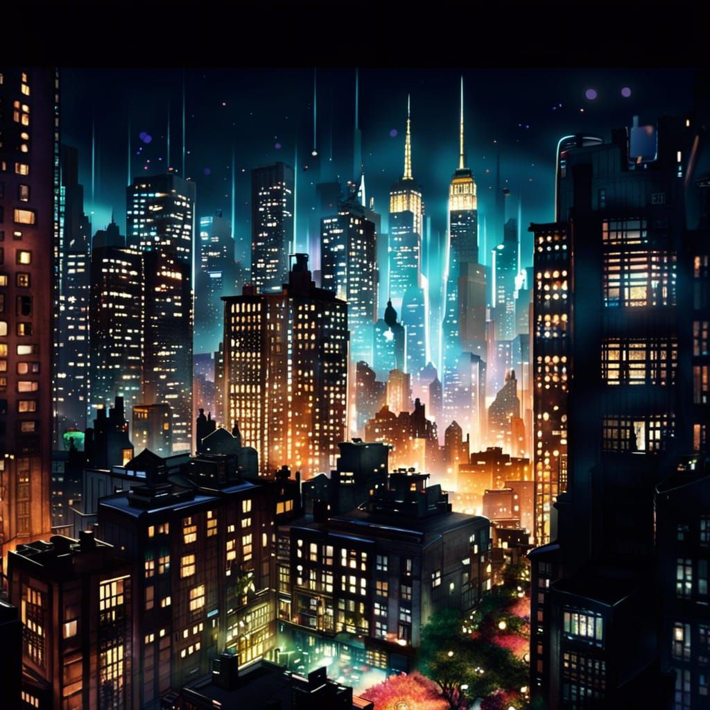 A vibrant nighttime view of New York City's skyline. The image captures the city's iconic skyscrapers illuminated with bright lights, depicted in a detailed anime art style.