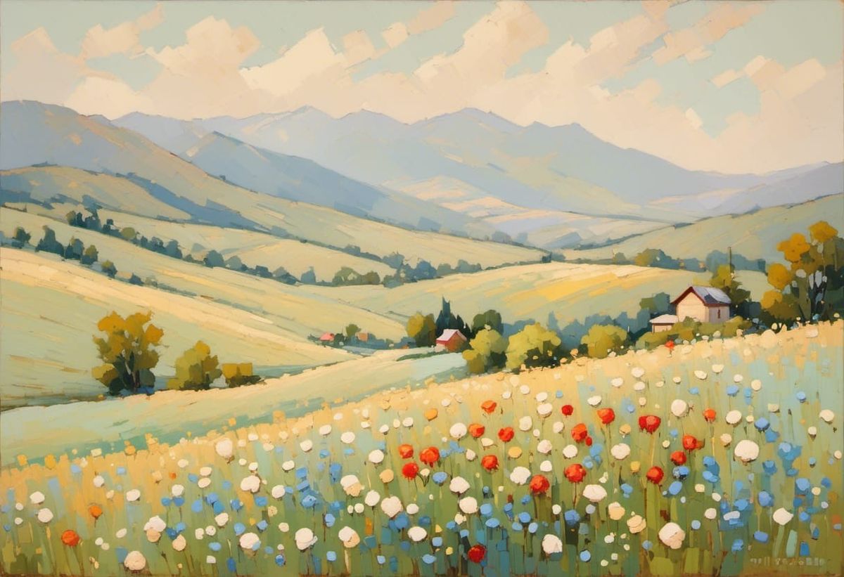 This image shows a serene foothills landscape with a small cabin. The artwork is rendered in subtle pastel colors and utilizes impasto techniques to create texture and depth.