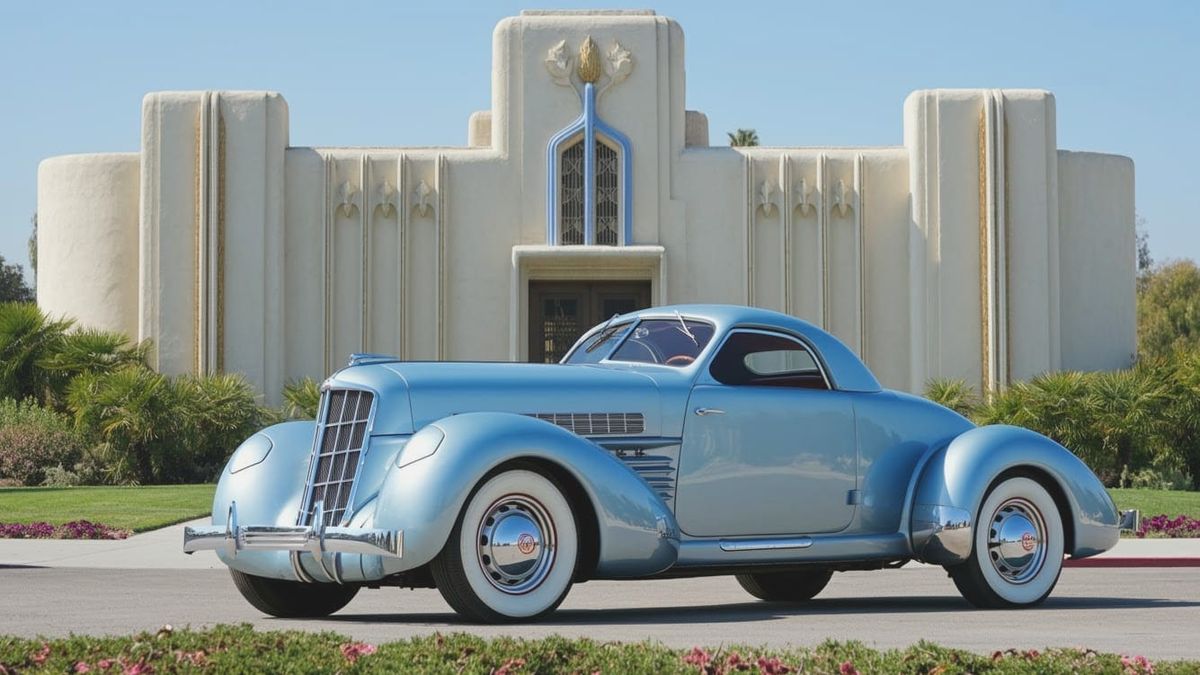A striking picture of a custom Auburn-Cord hot rod parked in front of the Thalburg Building at MGM Studios in 1941. The car is finished in pale blue stainless steel.