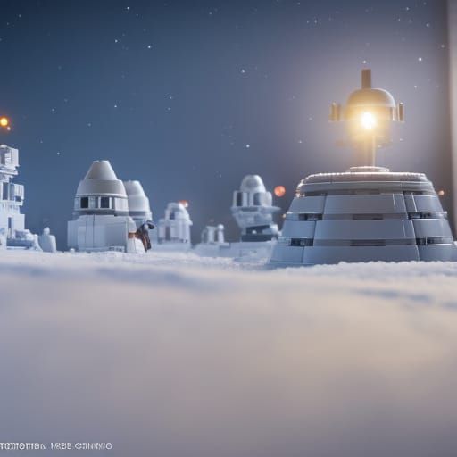 This image shows a meticulously detailed Lego Star Wars Hoth base enveloped in frozen fog. The photorealistic rendering captures the scene with sharp focus and natural lighting.