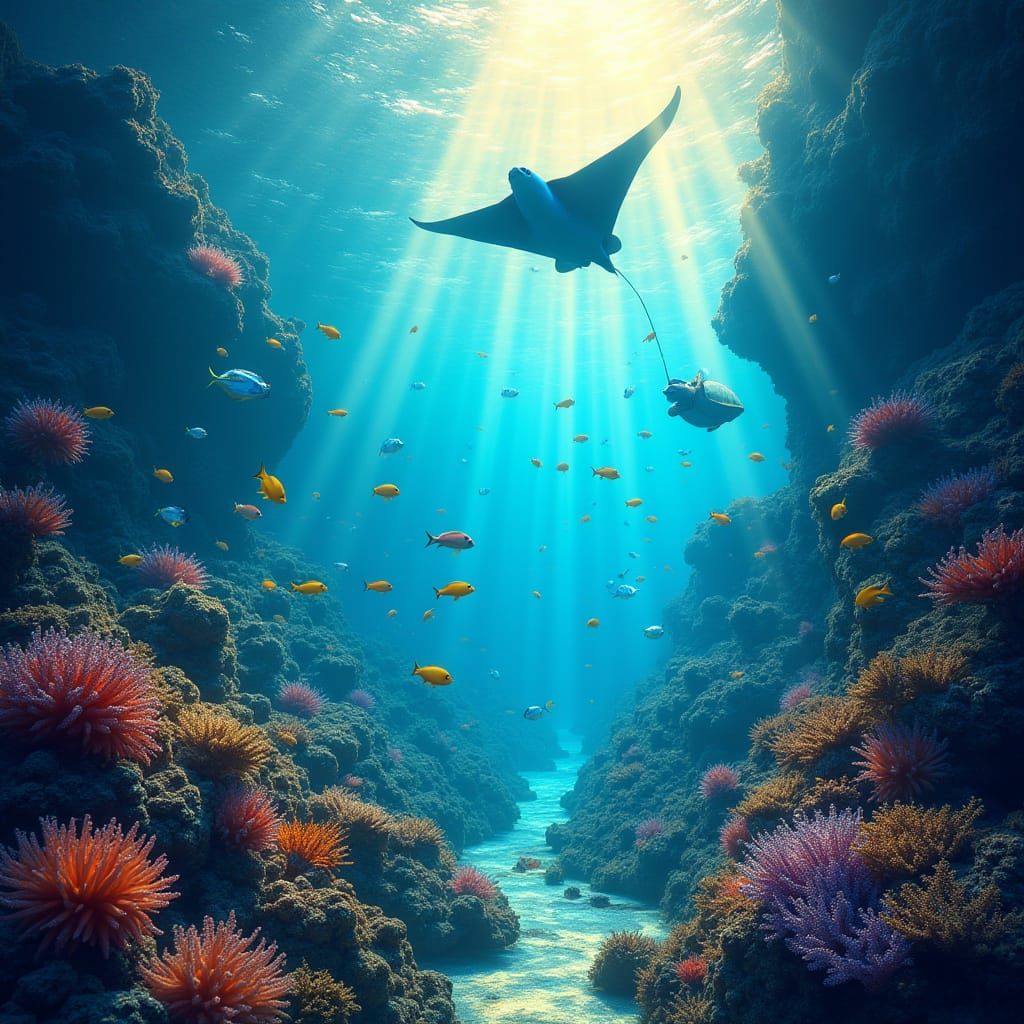 This image shows a kaleidoscope of colors beneath the ocean's surface, with vibrant coral, schools of fish, and a majestic manta ray in a warm, golden light