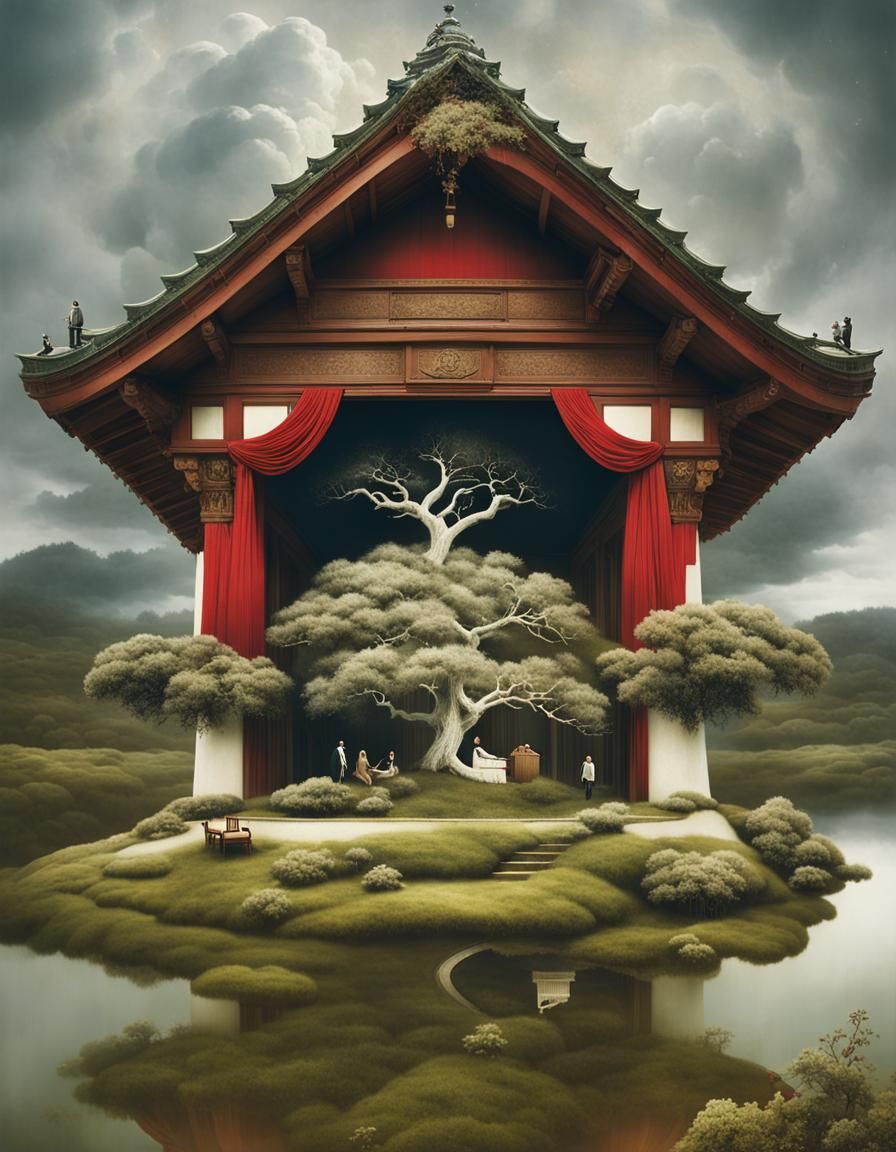 Impossible epic surreal Distorted unbalanced reality masterpiece by Martin Stranka, illusion, juxtaposition; misty luminescent surreal image that depicts the passage of time and the creation of the cosmos and the earth. White House with a red roof, ancient bonsai with victorian cottages and glittering ...