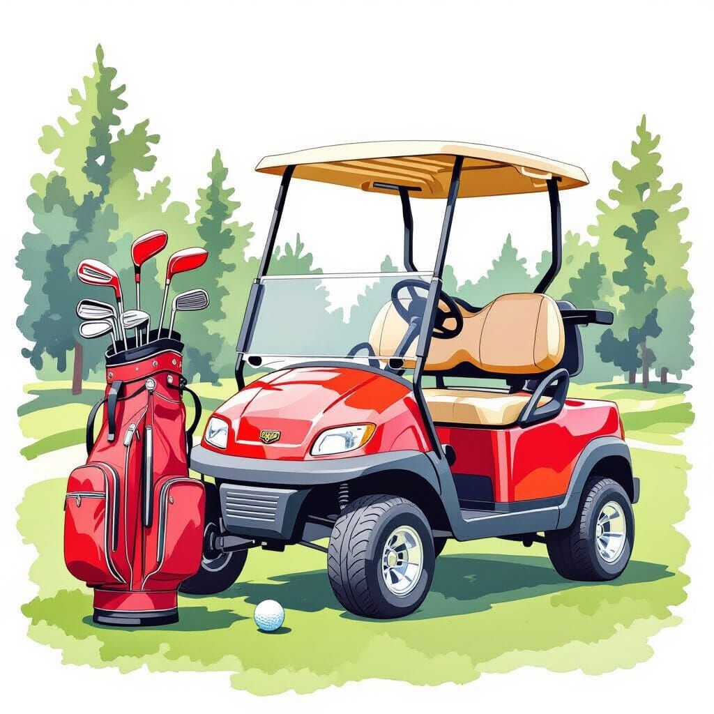 This image showcases a vibrant watercolor illustration featuring a golf cart, red golf bag, club, and ball. It has vivid colors and expressive brushstrokes, in the style of contemporary watercolor art.