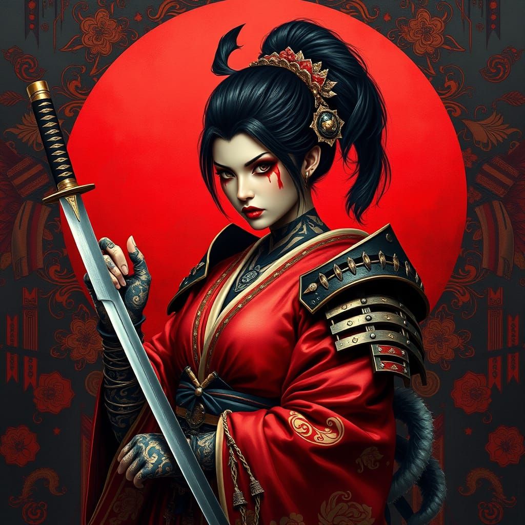 This image depicts a striking, photorealistic depiction of a geisha warrior, blending traditional Japanese design with dark fantasy elements. The subject wears intricate tattoos, samurai armor, and a blood-stained kimono, set against a dramatic red sun backdrop with ornate details.