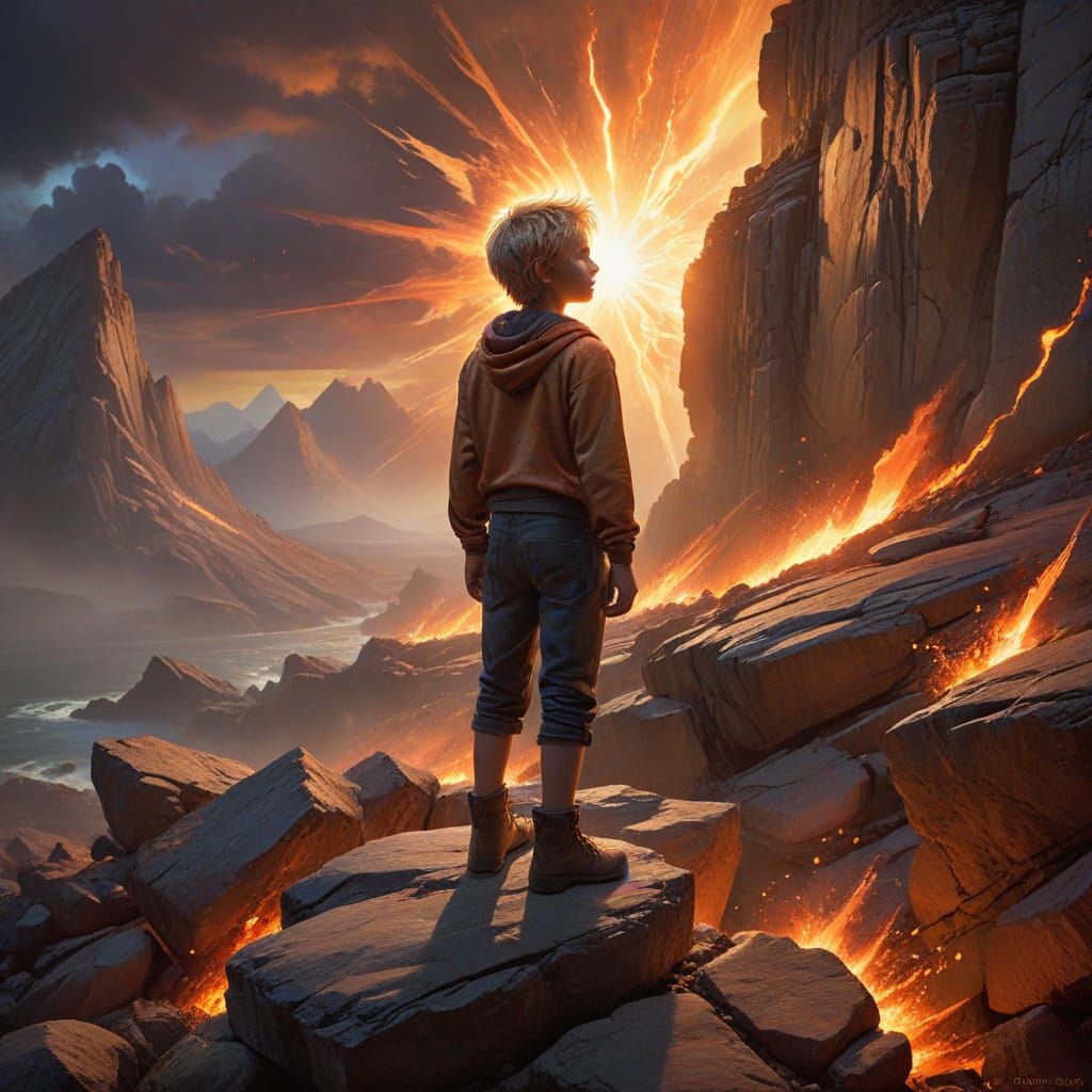 A striking picture of a blond boy on a cliff, looking at a fiery abstract landscape. Dynamic lighting and shading highlight details with luminous celestial incandescence.