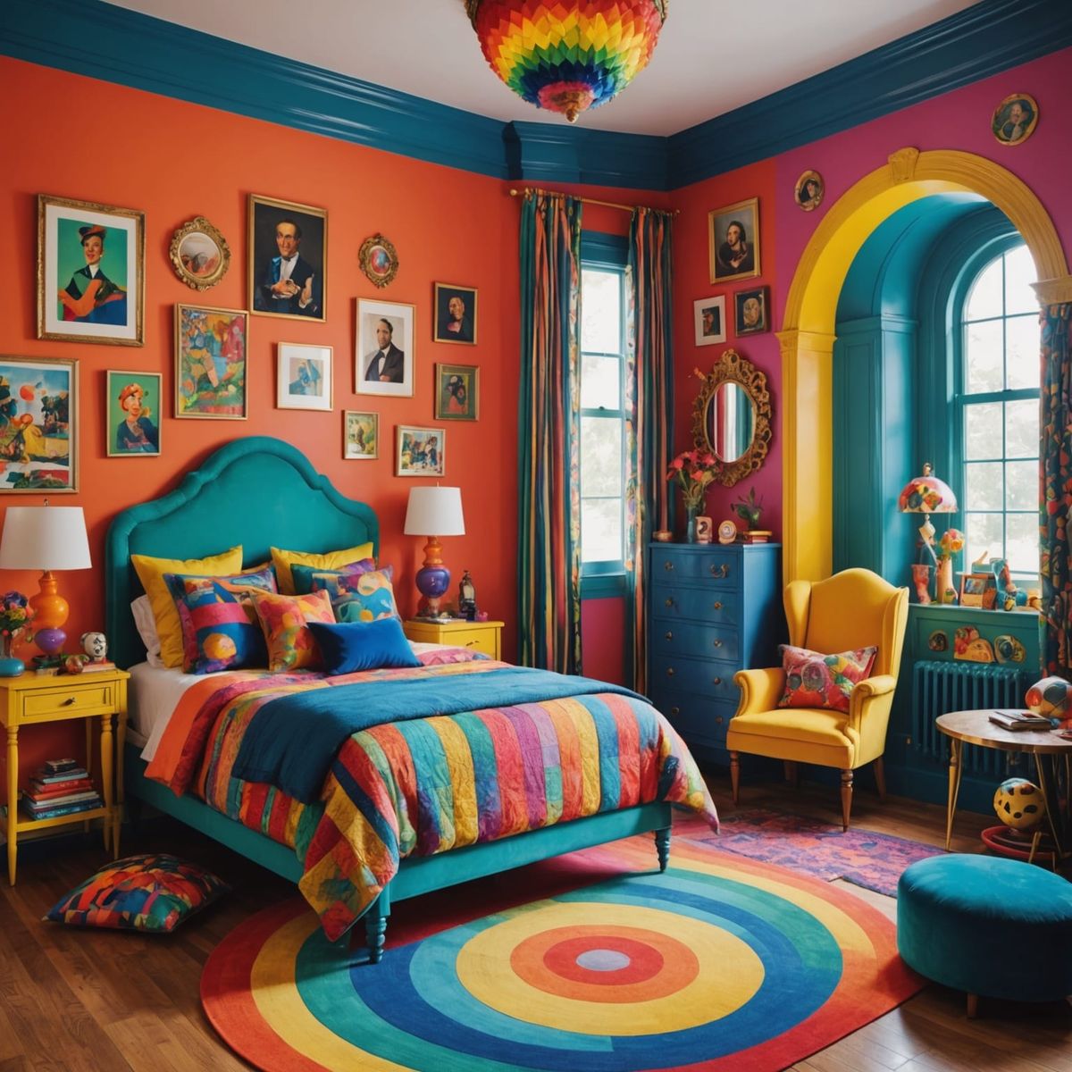 This image depicts a vividly colored, maximalist children's bedroom. The aesthetic is art deco, featuring bright furniture and ornate patterns throughout the room.