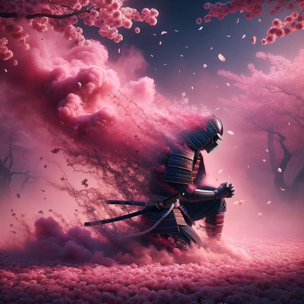 A kneeling ninja samurai fades into pink smoke and cherry blossom petals, symbolizing fading honor in an ancient Japanese setting with ethereal light.