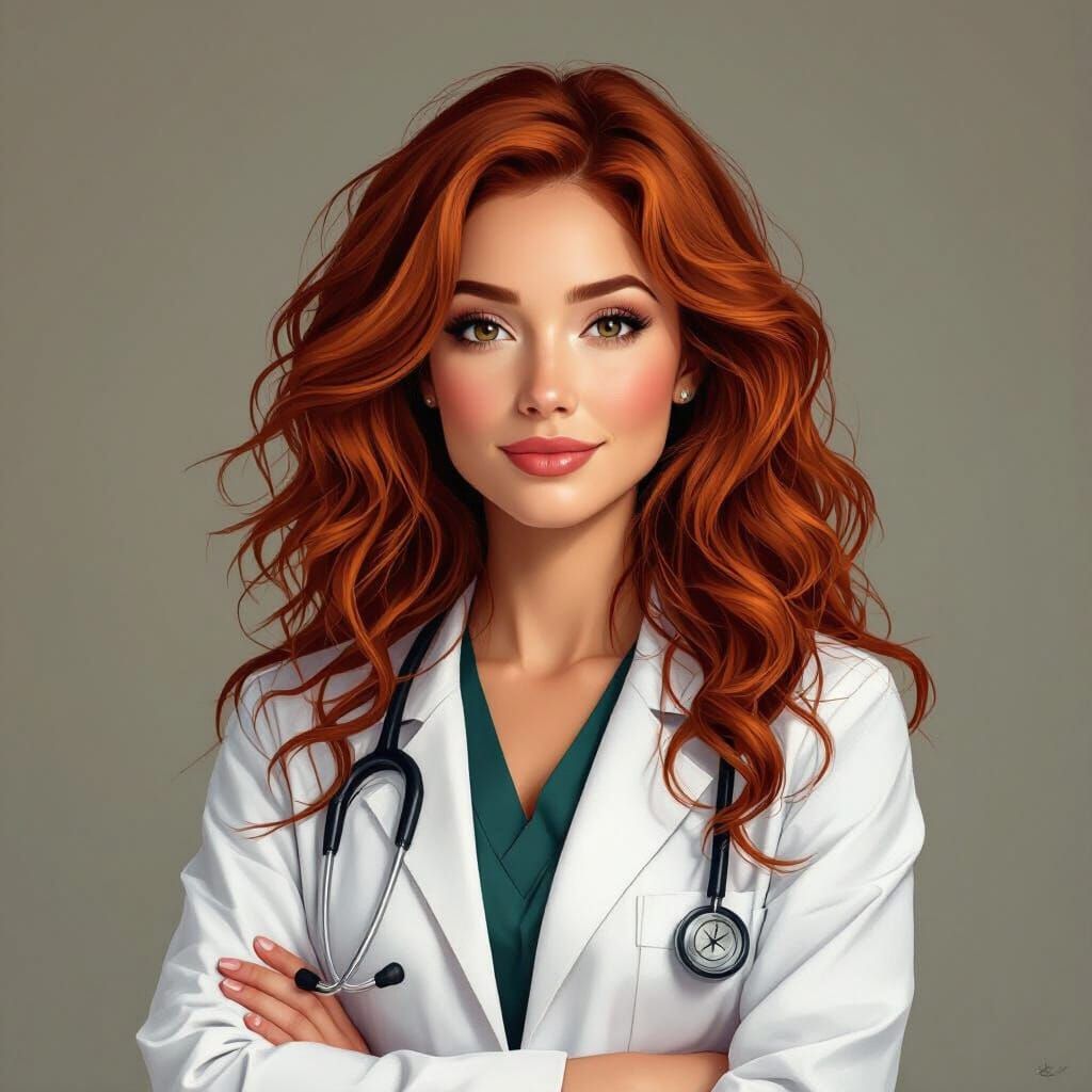 A realistic image of a beautiful female doctor with long, curly red hair, wearing a white coat. She is confidently posing in a three-quarter view.