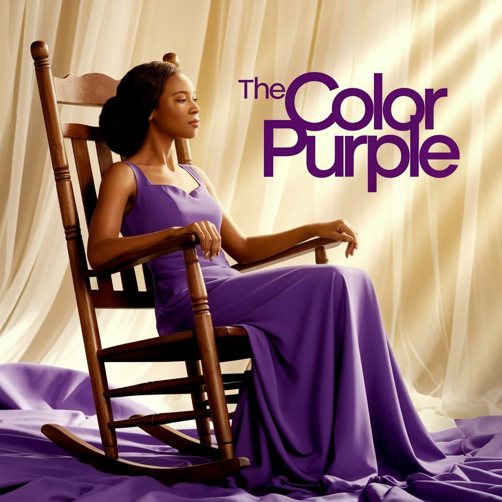 This image shows a movie poster featuring a woman in a rocking chair. The scene uses soft, golden lighting and a rich purple color palette, symbolizing warmth, resilience, and strength.
