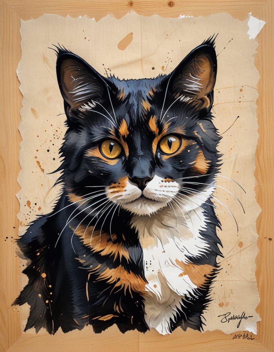This image features a calico cat portrait rendered in glossy black ink with expressive lines and touches of color on old parchment paper.