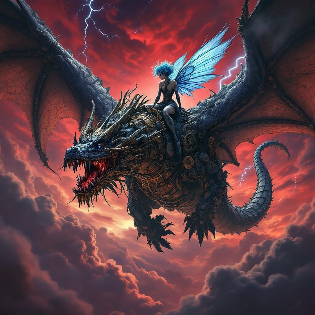 This image shows a majestic steampunk fairy in flight, accompanied by a colossal clockwork dragon, amidst a crimson sky with swirling clouds and lightning. Inspired by fantasy and gothic horror, this artwork embodies a sense of wonder and enchantment.