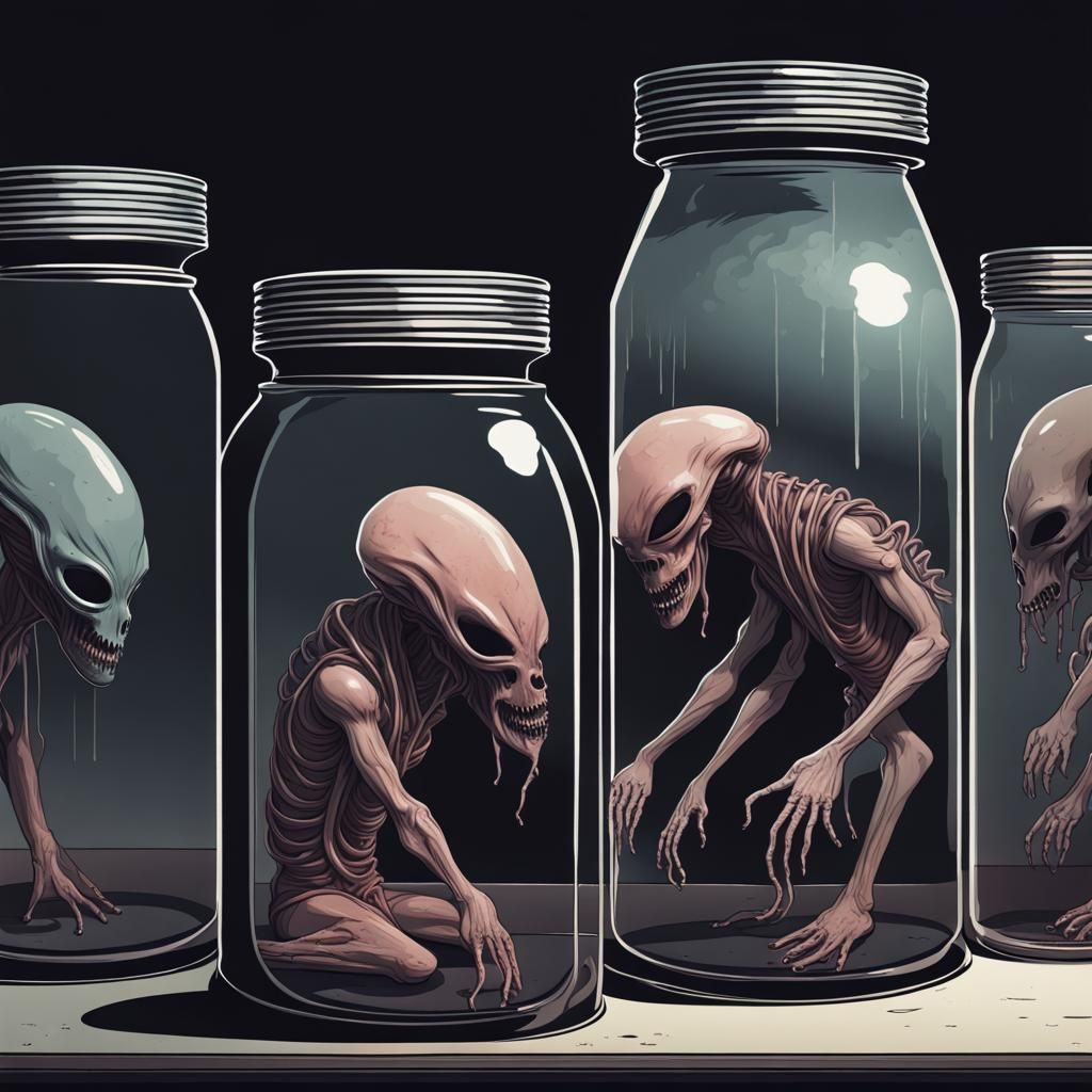 This image depicts alien body parts preserved within fluid-filled jars, creating a scene of horror and ghastliness. The dark, muted colors enhance the spine-chilling and evil atmosphere.