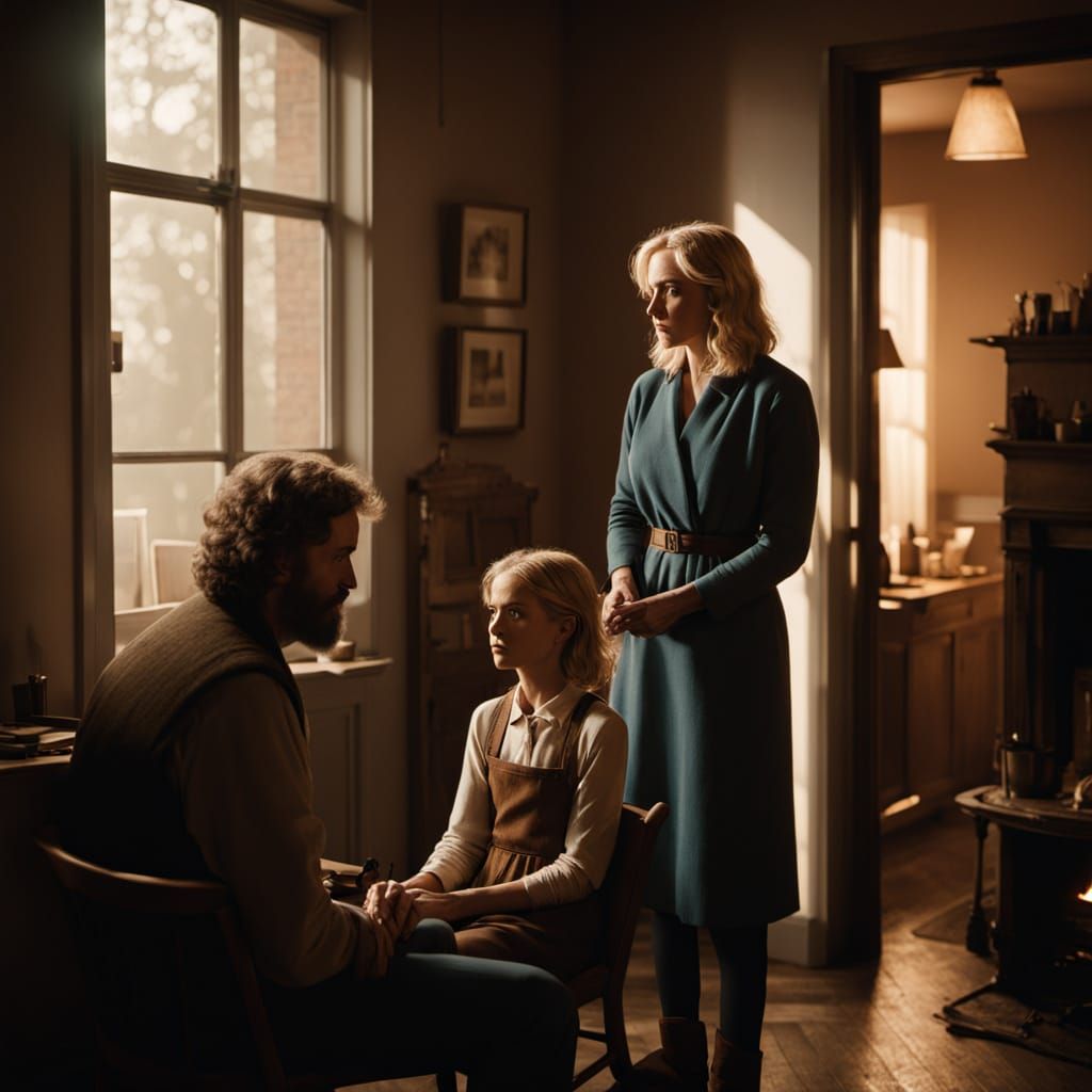 A cinematic film still depicts a young woman and her mother embracing in shock, while a guardian stands watch with a knife, a teenage boy observes from a window, and a small fire burns in the fireplace, illuminated by warm, soft light with a hint of blue tint, evoking a moody and atmospheric atmosphere.